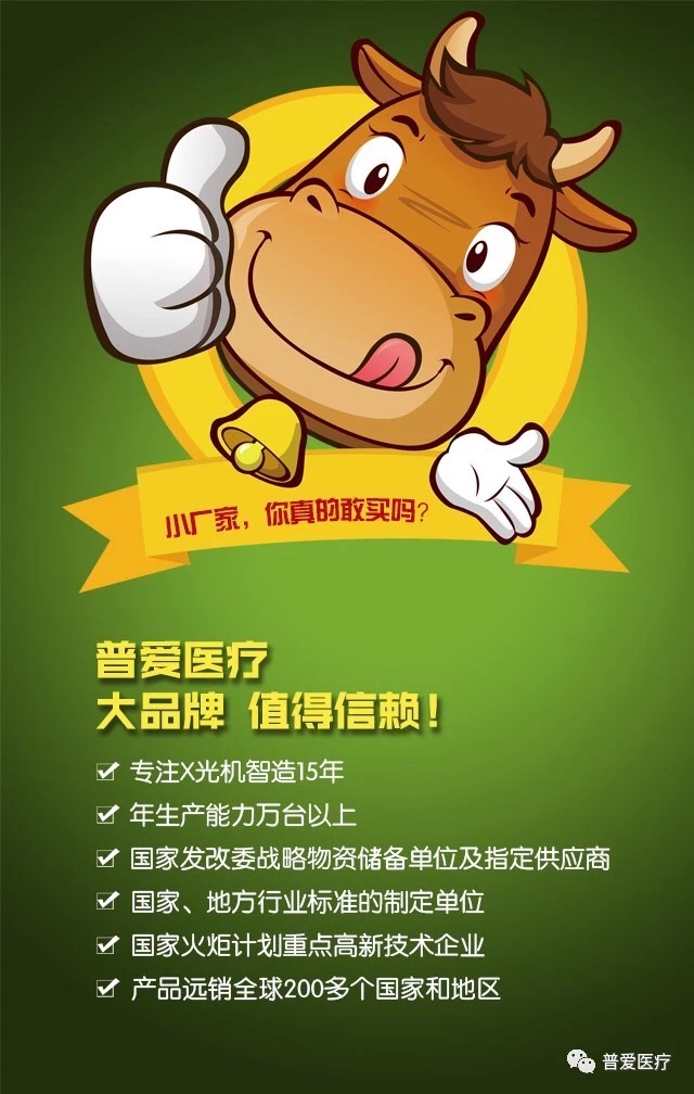 普愛醫療大品牌,值得信賴!普愛醫療專注X光機智造15年,年生產能力萬臺以上,國家發改委戰略物資準備單位及制定供應商,國家、地區行業標準的指定單位,國家火炬計劃重點高新技術企業,產品遠銷全球200多個國家和地區。